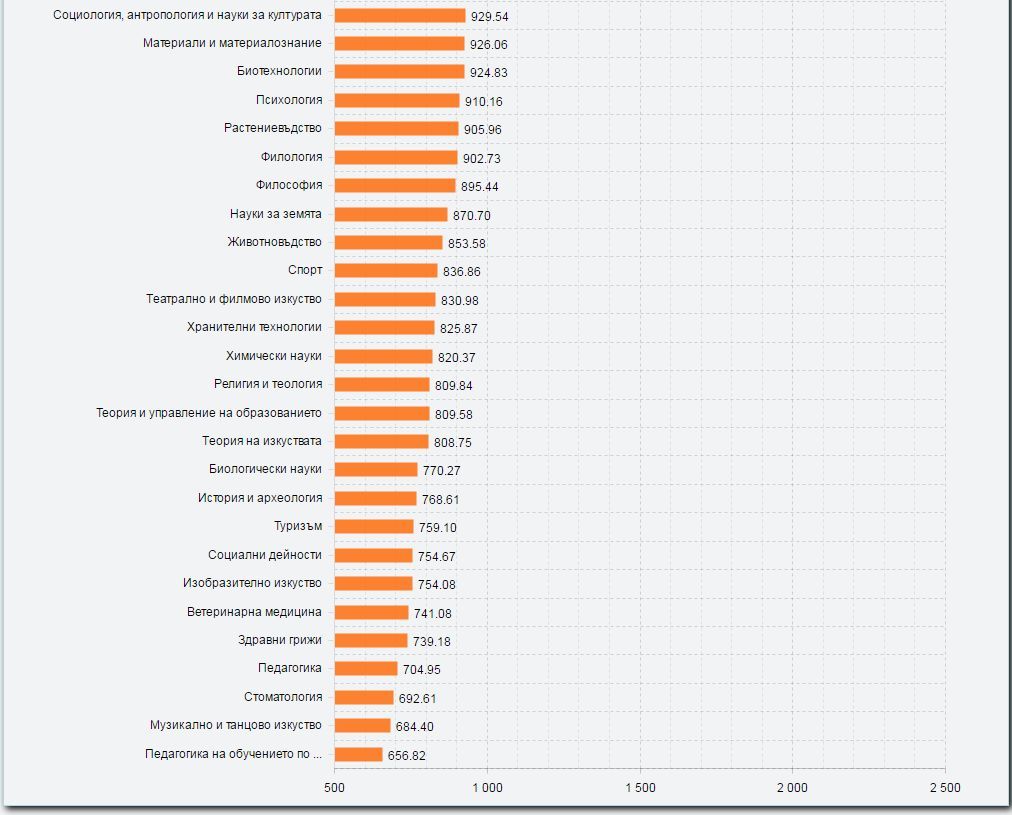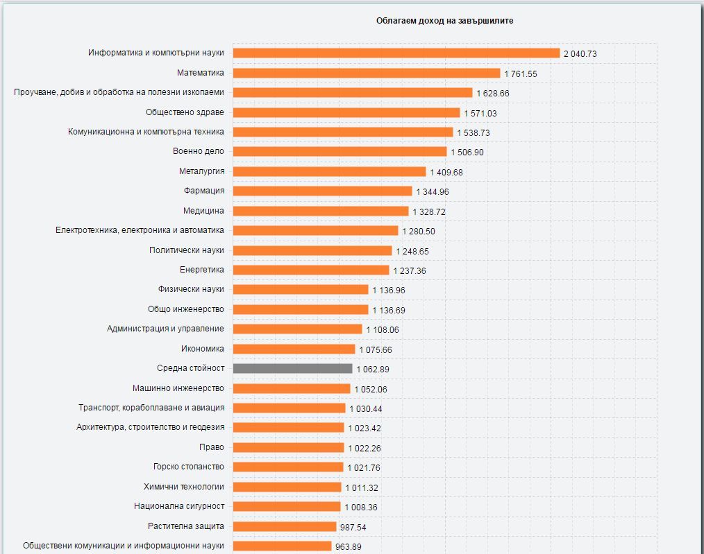 Най-високи средни доходи сред абсолвентите на висши училища в България получават завършилите професионални направления Информатика и компютърни науки, Матетматика, Проучване и добив на полезни изкопаеми, Обществено здраве, Комуникационна и компютърна техника, Военно дело, Металургия, Фармация, Медицина и Електротехника, електроника и информатика. Това показва новото издание на рейтинговата система на университетите в България, което бе официално представено.
